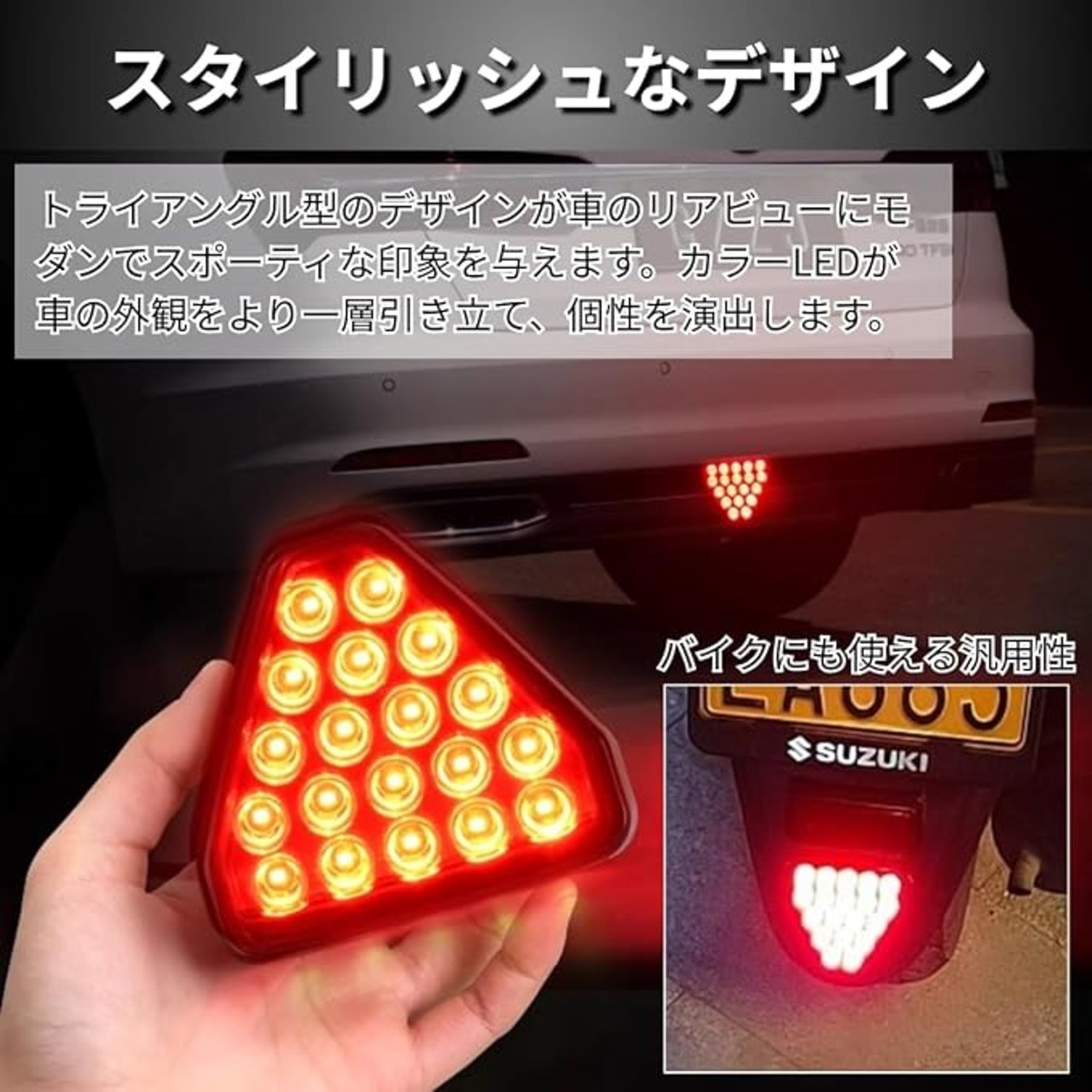 【洗練された F1 スタイル】 汎用タイプのトライアングル型、斬新なデザインが特徴です。F1 マシンのような洗練されたルックスは、すれ違う人々の視線を引きつけ、あなたの車の個性を際立たせます。カラーLEDが、日中はもちろん、夜間も圧倒的な存在感を放ち、スポーツカーやSUVとの相性は抜群です。