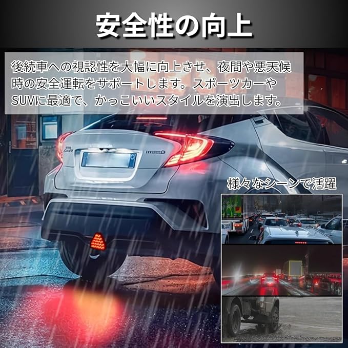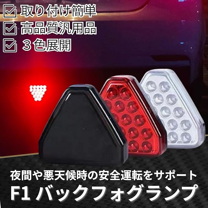 【商品詳細】F1スタイルのLEDバックフォグランプになります。後続車からの視認性を劇的に向上させ、あなたの愛車をスタイリッシュにカスタムしてみませんか? このLED ブレーキランプは、夜間や悪天候下での安全運転を強力にサポートし、同時にあなたの車にスポーツカーのような洗練された F1 スタイルをもたらします。