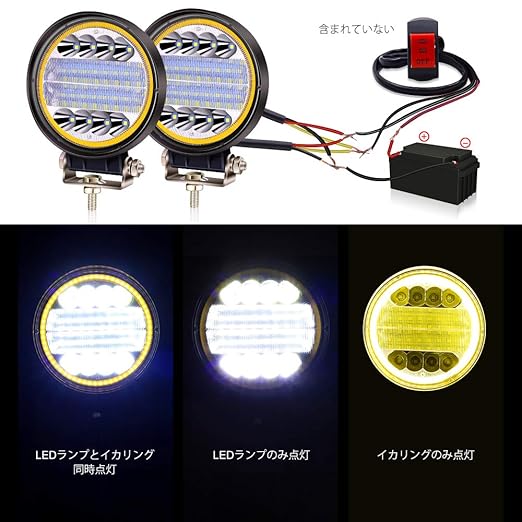 ★【角度調整可能&取付簡単】ステンレスステーが付き、ご希望の照明角度に合わせて作業ライトを縦方向で調整でき、対向車に気遣いならも簡単にライトを下向きにすれば大丈夫です。☆☆配線法:赤&黄+、黒ー(赤線はホワイトLED、黄色い線はイエローイカリングを制御)。☆パッケージ内容について:一つの紙箱にLED作業灯2個&取付金具2式が入っております。