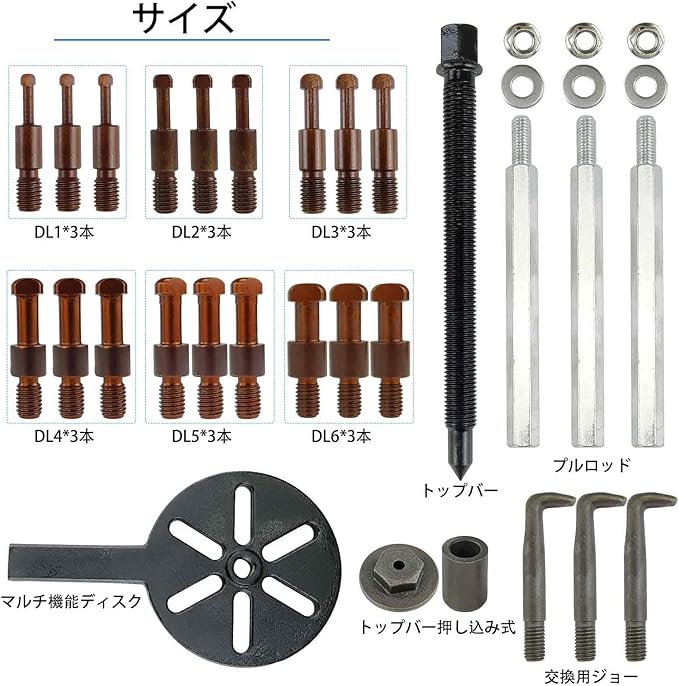 21点セットで幅広い作業に対応-6種類のコレットサイズと3つの追加フック付き,DL1~DL6プーラーヘッドと組み合わせて、様々なベアリング脱着作業を効率的に行えます。