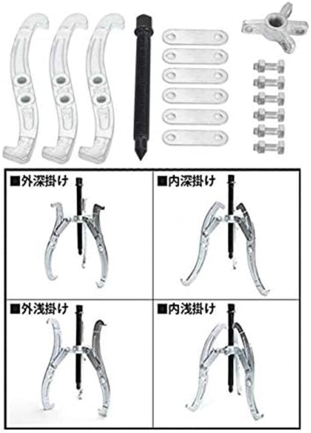 ✅ギヤやベアリング、プーリーなどの取外し工具となります。車両だけでなく、ドラム式洗濯槽やダクトなど特殊な引き抜き工具として重宝します。引き抜く対象の形状により内掛け・外掛けにも簡単に対応可能です。