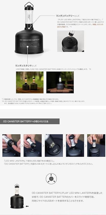 ポータブルハブバッテリー「OD CANISTER BATTERY」とアタッチメント可能な、オリジナルデザインのLEDランタン(蓄光タイプ)。 バッテリーを内蔵しているためランタン単体でも使用可能ですが、「OD CANISTER BATTERY」(別売)と組み合わせることでより実用的に。本ランタンのUSB-A充電コネクタを「OD CANISTER BATTERY」の天面USB-Aポートに挿し込むことで、"給電"と"スタンド機能"を一体化したスマートな使用が可能となります。 また、持ち運びやすいミニマルなサイズ感ながらも最大120ルーメン&使いやすいダイヤル式無段階調光機能を搭載し、キャンプ等で快適に使える機能をプラスしました。