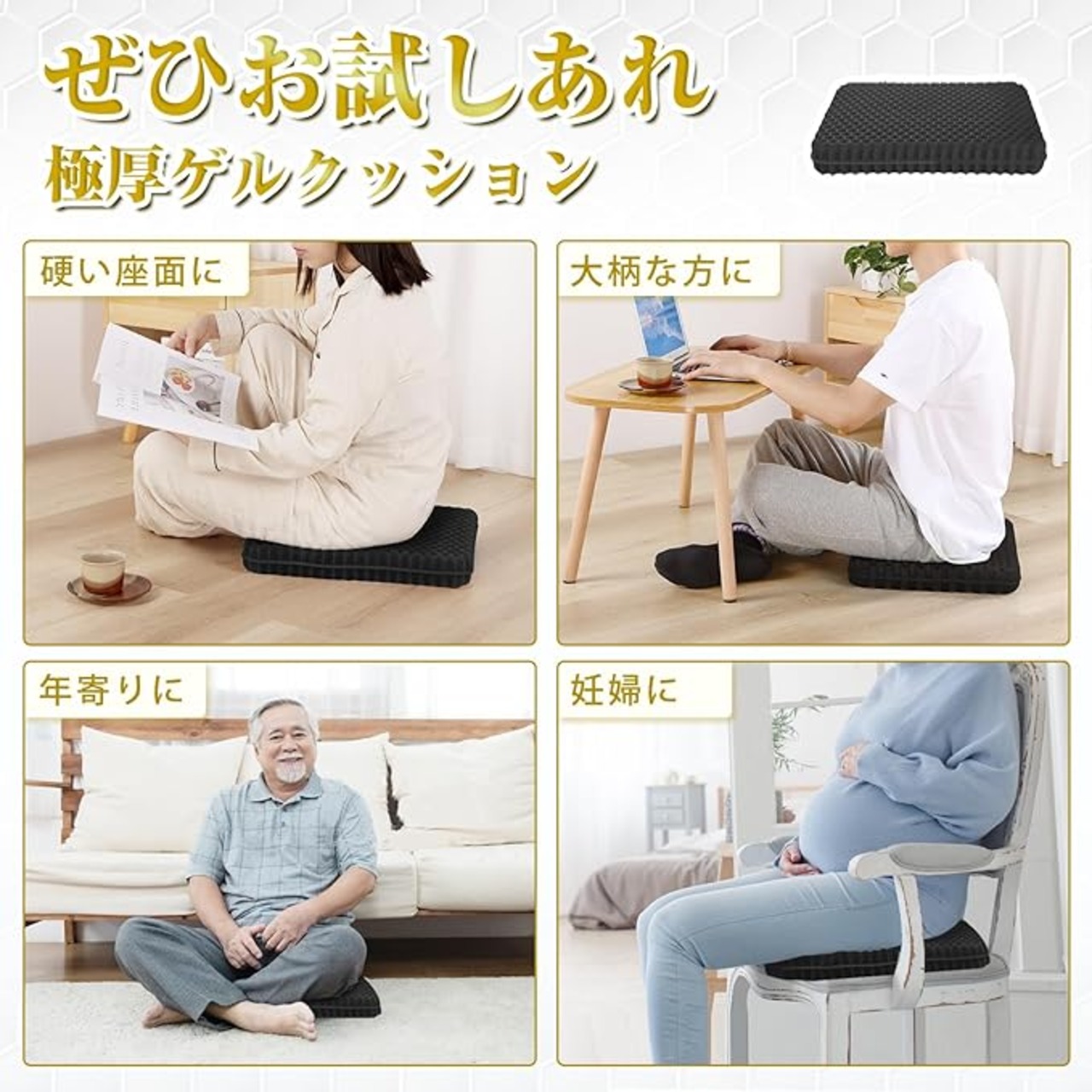 【極厚・贅沢な60㎜】こちらは極厚クッションがお好みの方のために厳選しましたゲルクッションになります。厚さは60mmなので、座ると「おっ、これが無重力か」ってなるほどの厚みと弾力性をもつ一品です。