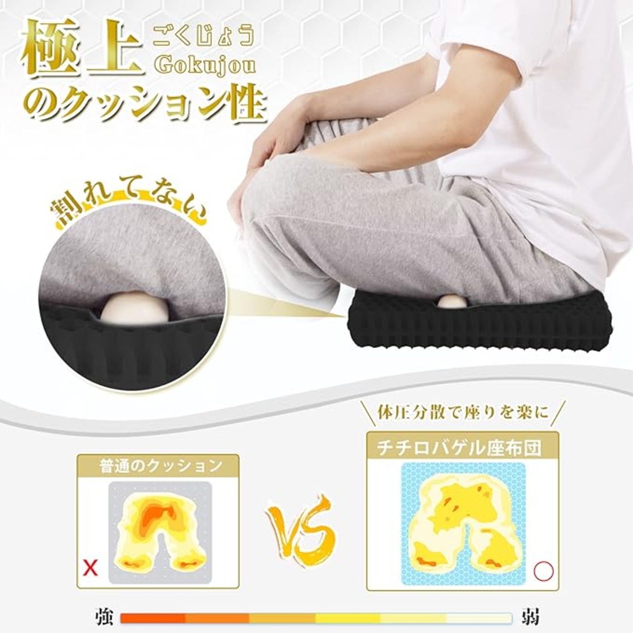 【極上・クッション性】厚い分体圧分散効果も顕著、ゲルの弾力性で水面に浮くような座り心地を実現。長時間座ってもおしりが痛くなりにくい。座布団としてもお使いいただけます。