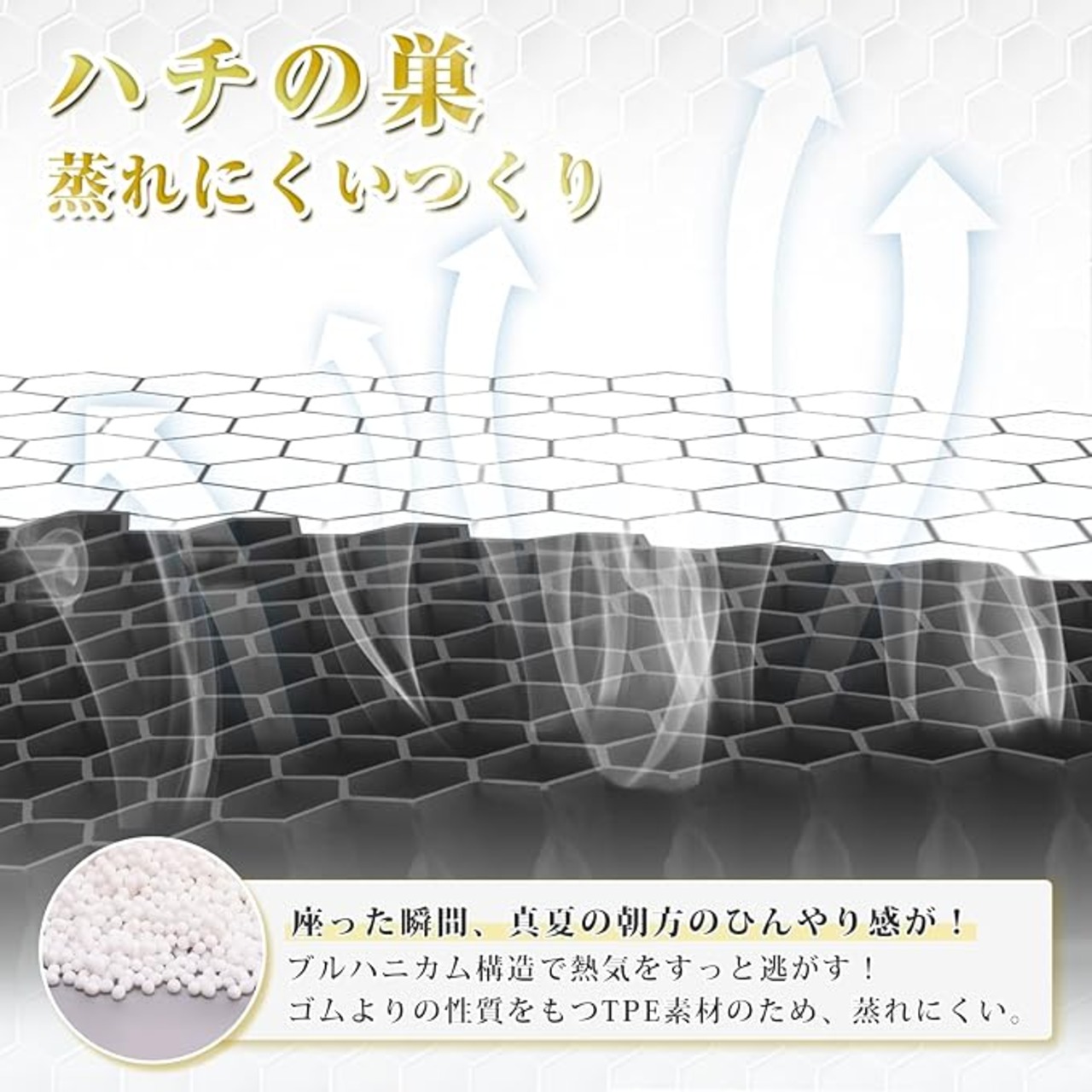 【蒸れぬゲル座布団】今話題のハニカム構造ゲルクッション、ハニカム構造が二層になっており、ゲル素材ならではのひんやり感と相まって、通気性も◎。一般的なクッションと比べてダントツに蒸れにくいゲルクッションです。