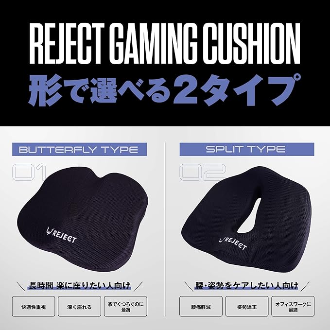 【プロeスポーツチーム監修】 REJECT クッション 椅子 腰痛 ゲーミングチェア オフィスチェア リモートワーク デスクワーク ゲルクッション 座布団 低反発 姿勢矯正 坐骨神経痛 GAMING CUSHION (BUTTERFLY TYPE) | KAZESHOP