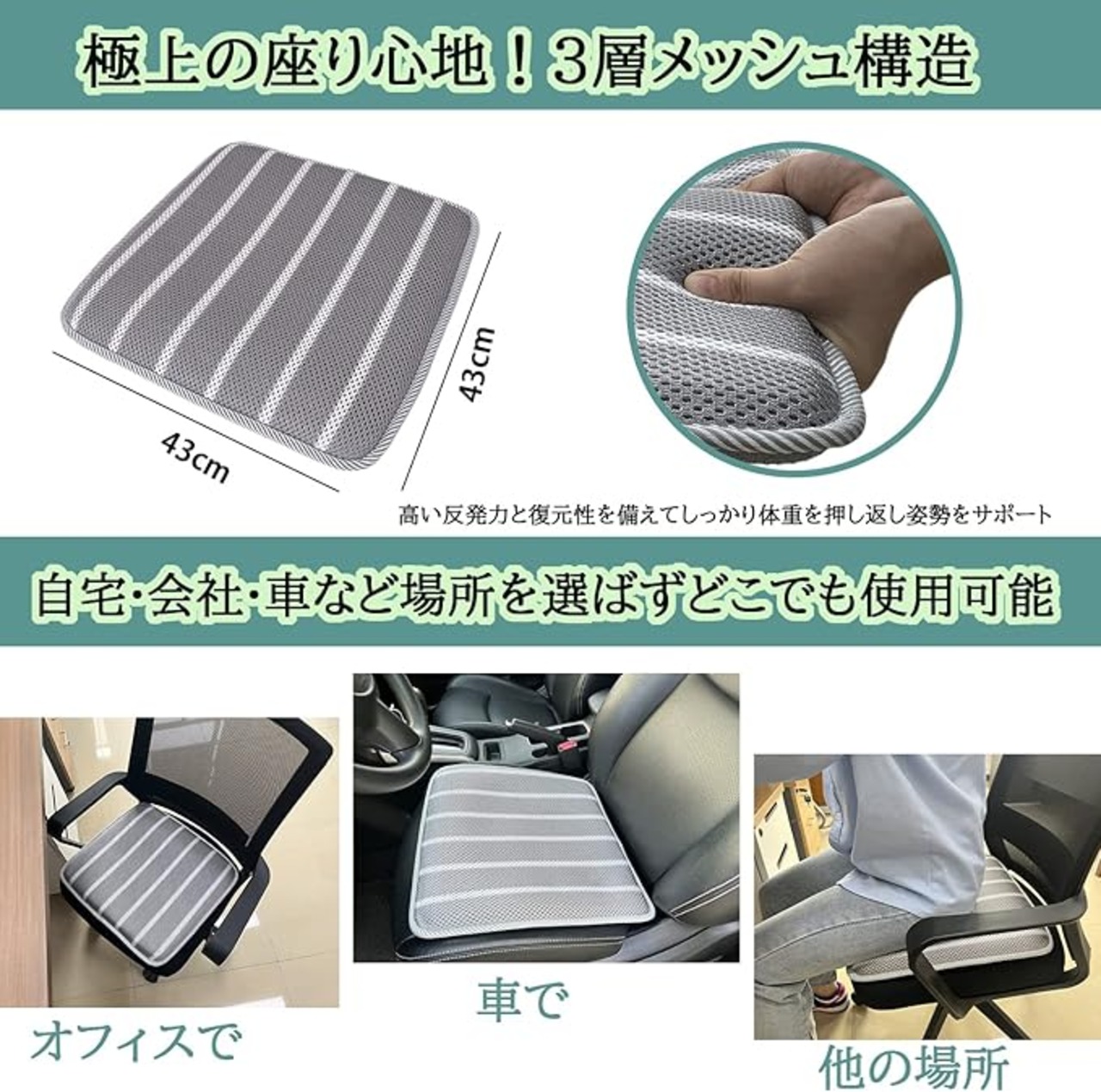 新感覚素材:ハニカム構造でポリエステル100%のメッシュ素材を採用しています。表面と中身ともに通気性が高く、お尻に設置した部分の熱を効率的に逃し、長時間の使用や夏場でも蒸れにくく、快適な座り心地です。本製品は厚さ1cmのメッシュで3層を重ねます。400万個粒子で支えられていて、立体的デザインによりサポート力が強く、長時間を座っても決して変形しません