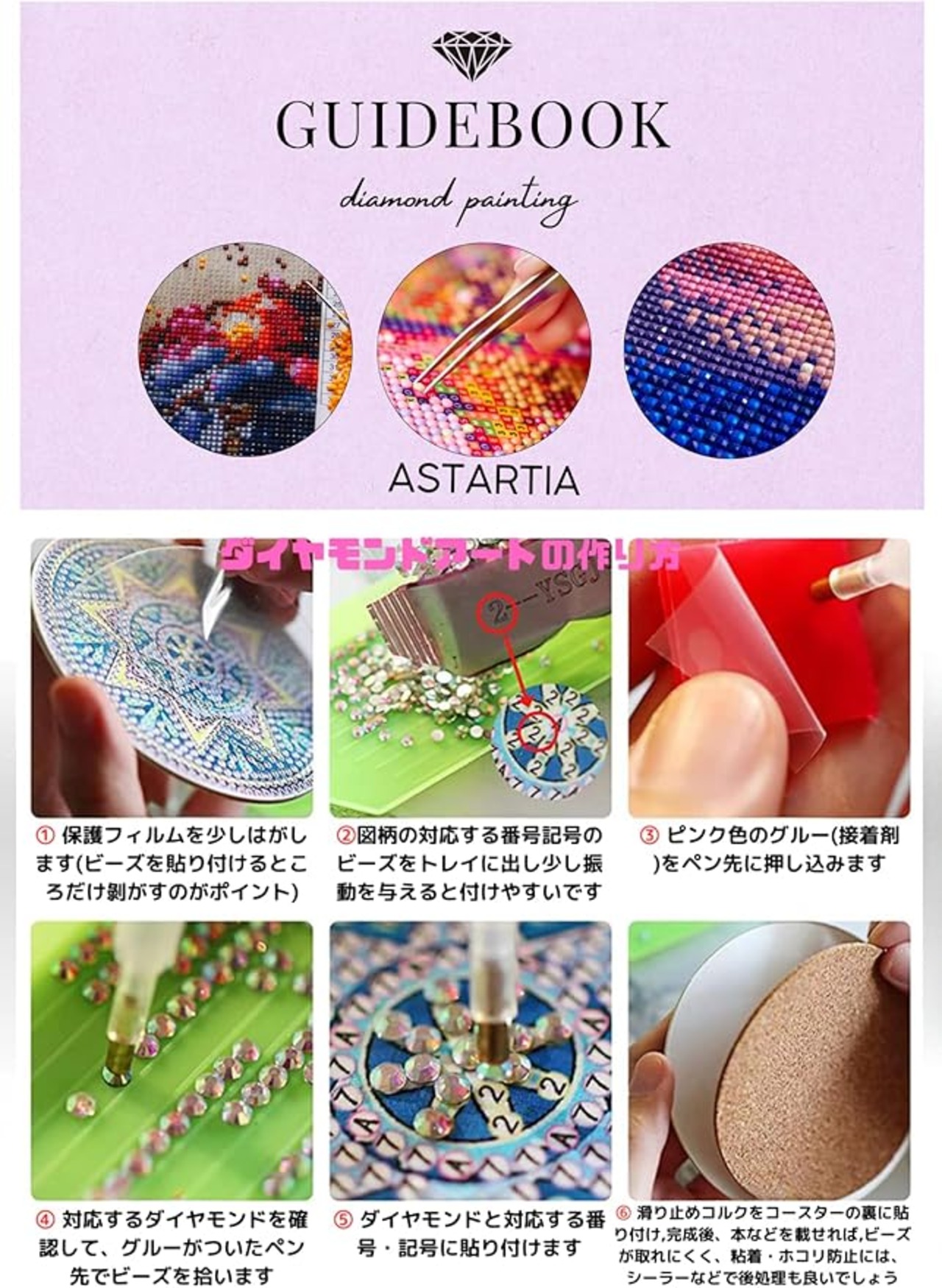 Astartia ダイヤモンドアートキット ペインティング塗装コースター 曼荼羅6枚 【ダイヤモンドアートコースターセットパッケージ内容】 ☆曼荼羅ダイヤモンドアートコースター:6枚 ☆コルクマット;6枚 ☆コースターホルダー:1台 ☆カラフルなダイヤモンド:1セット ☆ビーズトレイ:1個、ダイヤモンドペン:1本 ☆グルー:1個☆チャック付ビニール小袋:5枚 ☆日本語取扱説明書付 【ダイヤモンドアート コースターの作り方】簡単な手順で、キラキラ輝く曼荼羅モチーフのコースターが作れます。 ■<作り方はとっても簡単>専用ペン先にグルー(接着剤)を付けます。台紙の記号や数字に合わせて、ビーズを貼り付け、コースターの裏にコルクマットを貼れば完成です。 ■<ワンランク上の仕上がりを目指すなら>ビーズが取れやすい場合や、ほこりが気になる時、表面を保護したい場合は、仕上げにシーラーを使うのがおすすめです。あなただけのオリジナル曼荼羅コースターを作って,手作りの楽しさを体験してください。 ■まるで、宝石をちりばめたような、美しい5D効果のキラキラかわいい”曼荼羅"コースターが出来上がります。ユニークで可愛い曼荼羅のデザインは、あなただけのオリジナル。集中して作品つくりを楽しむうちに、達成感で満たされるはずです。手作りならではの温かさと、実用性を兼ね備えたダイヤモンドペイントコースターは、今、人気の手芸です。 【幅広い年齢層 初心者から大人までで楽しめるダイヤモンドアート】 ■対象年齢:6歳以上 初心者の方でも安心して始められる手軽な手芸キットです。 ■特徴 ・直径約10cmの扱いやすい丸型サイズ ・記号や番号で簡単に図案を完成 ・低学年のお子様でも迷わず作成可能 ■おすすめの活用シーン ・夏休みの自由研究 ・休日のリラックスタイム ・親子で楽しむDIY ・趣味としての手芸入門 ■期待できる効果 ・集中力の向上 ・達成感が得られる ・リラックス効果 ・創作意欲の向上 シンプルな作り方で、完成時の見栄えの良さから、親子での制作にも人気のクラフトキットです。 ■高齢者のリハビリにも有益、 指先を使う作業は、脳の活性化やリハビリにも効果が期待できます。 【大切な人に手作りを贈ろう! ダイヤモンドペイントコースターはギフトにも最適】 美しい輝きと温かさを兼ね備えた、手作りのダイヤモンドペイントコースター。 大切な人に贈る、心のこもったギフトにぴったりです。 ■こんなシーンにおすすめ 誕生日プレゼント 記念日の贈り物 結婚祝い 新築祝い 引越し祝い 先生や上司への感謝の気持ち <贈る相手への思いやりが伝わる贈り物> 世界に一つだけの輝きを放つダイヤモンドペイントコースターは、贈る相手の心を暖かく照らします。 作る楽しさを体験できるのはもちろん、実用的なアイテムとしても喜ばれるでしょう。 感謝の気持ちを込めて、愛する人へのプレゼントとしても最適な一品です。 【安心の品質保証とアフターサービス】 このダイヤモンドアートコースターは、日本の企業Astartia(アスターティア)が企画・輸入し、お客様に安心して楽しんでいただけるよう、アフターサービスまで責任を持って対応しています。