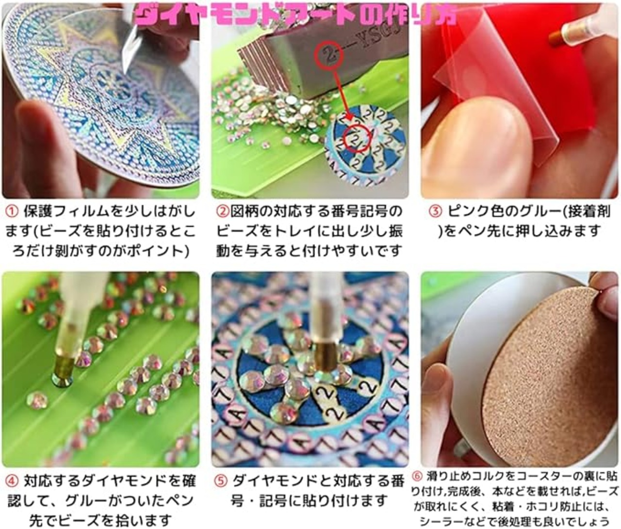 ◆【ダイヤモンドアート コースターの作り方】簡単な手順で、キラキラ輝く曼荼羅モチーフのコースターが作れます。 ■<作り方はとっても簡単>専用ペン先にグルー(接着剤)を付けます。台紙の記号や数字に合わせて、ビーズを貼り付け、コースターの裏にコルクマットを貼れば完成です。 ■<ワンランク上の仕上がりを目指すなら>ビーズが取れやすい場合や、ほこりが気になる時、表面を保護したい場合は、仕上げにシーラーを使うのがおすすめです。あなただけのオリジナル曼荼羅コースターを作って,手作りの楽しさを体験してください。 ■まるで、宝石をちりばめたような、美しい5D効果のキラキラかわいい”曼荼羅"コースターが出来上がります。ユニークで可愛い曼荼羅のデザインは、あなただけのオリジナル。集中して作品つくりを楽しむうちに、達成感で満たされるはずです。手作りならではの温かさと、実用性を兼ね備えたダイヤモンドペイントコースターは、今、人気の手芸です。