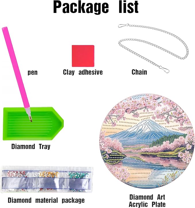 ハンギングダイヤモンドアートキットには、全ての必要なアイテムが含まれています:ダイヤモンドアートハンギングデコレーション、ダイヤモンドアプリケーターペン、接着ワックス、そして簡単に吊るせる20cmのチェーン。追加のアクセサリーは必要ありません。作品を完成させたら、すぐに美しい装飾品として楽しむことができます