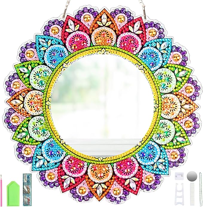 このダイヤモンドアートは、キラキラ輝く美しいダイヤモンドビーズで、曼荼羅(マンダラ)模様の化粧鏡を作ることができる手作りキットセットです。完成後は壁掛けミラー、卓上ミラーとして活用できます。