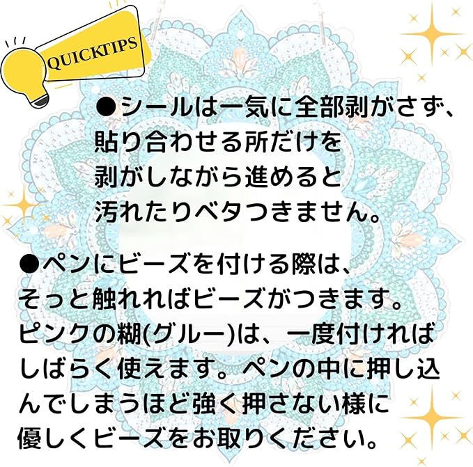 鏡には保護シートがついています。剥がしてご使用ください。完成した鏡は光に当たるとキラキラと輝くので、お部屋や玄関に飾ると素敵なインテリアに。また、プレゼントにも華やかです。