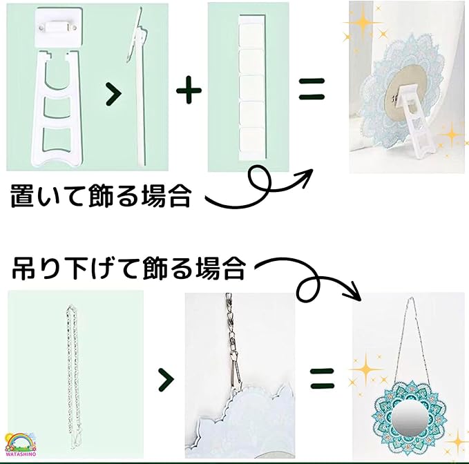 サイズ 直径約20cm、セット内容 鏡、アクリル板図案、ビーズ、ペン、トレイ、ピンクのり、チェーン、両面シール、スタンド。製造国 中国。パッケージデザインは2種類ございます。