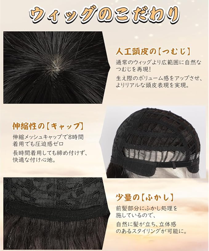 【ウィッグの細部】高品質なマット素材で、本物の髪のような自然な質感。生え際はリアルな仕上がりで、つむじも本物そっくり。通気性バツグンのネットキャップだから、長時間つけていても蒸れにくい設計です。