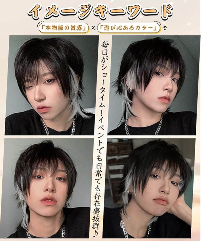 【装着効果】このウィッグを着用すると、一瞬でクールでスタイリッシュな印象に変身します。表面のナチュラルブラックは日常使いに最適ですが、動きに合わせて内層の色がチラリと覗くことで「クールさの中に潜むワイルドな一面」を演出。ウルフカットのシルエットが後頭部にシャープなラインを作り出し、スタイリングツールで毛先を立てればより鋭い印象に。