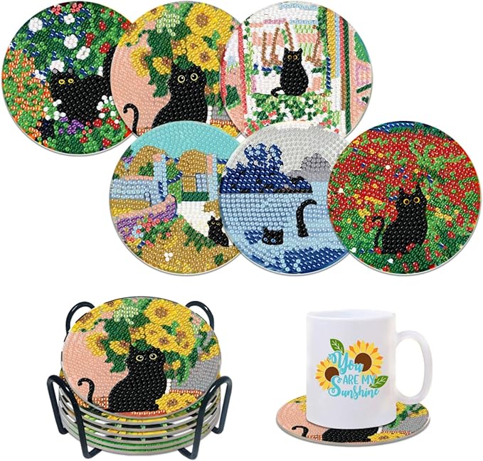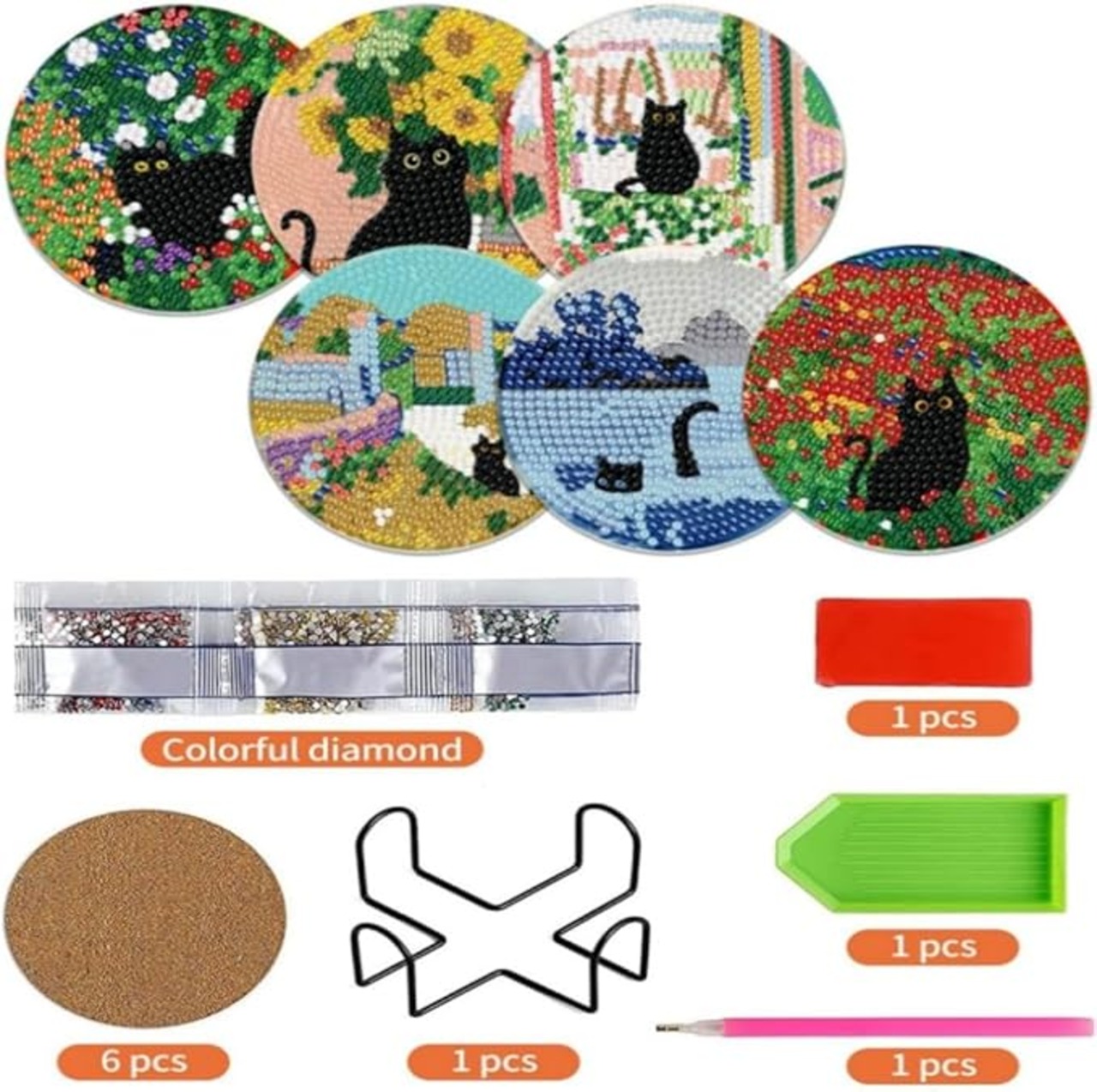 ダイヤモンドアート コースター キット 6個入 ダイヤモンドペインティング DIY ダイアモンドアート かわいい ネコ 漫画風 モザイク飾り物 装飾用 初心者 手作りキット 付属ラック | KAZESHOP