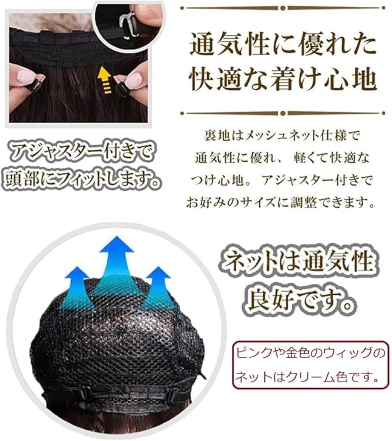 ・ウィッグの裏のネットは通気性良好、サイズはフリーサイズ、アジャスターでサイズ調整可能です。