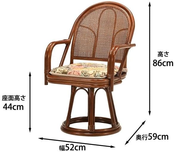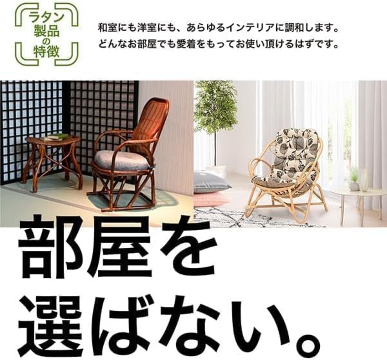 軽量で丈夫な天然ラタンを使用したラタンチェア。首元までしっかり支えるハイバック仕様。立ち座りや出入りに便利な肘付回転機能搭載。和室でも洋室でも合わせ易いベーシックデザイン。