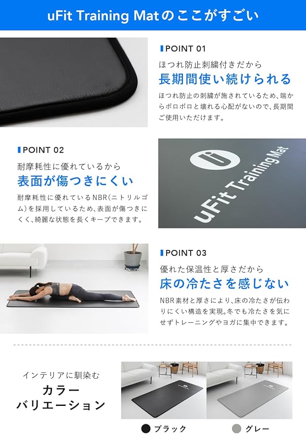 【日本国内メーカー】uFit Trainingmat トレーニングマット 10mm 15mm 厚め 90cm*200cm 幅広 大きめ 痛くない 滑らない PVC 防音 防水 プロアスリート 水谷隼 愛用 | KAZESHOP