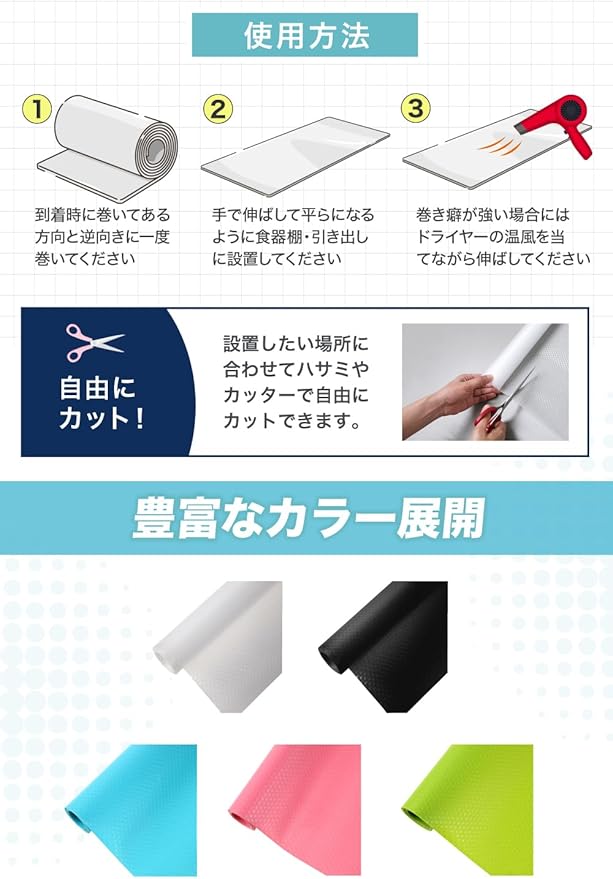 【①簡単設置】ハサミで簡単に切れ、食器棚や引き出しに敷くだけでOK。