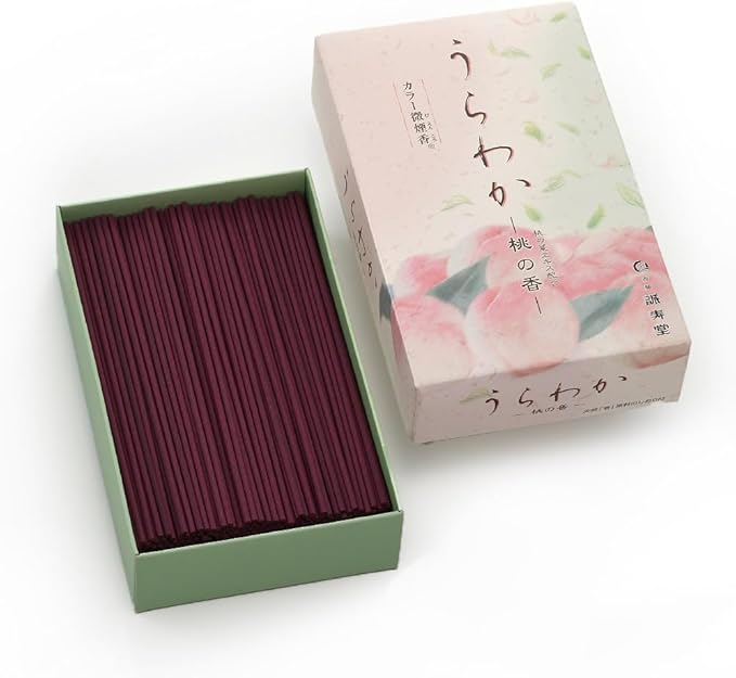 【うらわか-桃の香-】煙の少ないお線香です。自然で優しい香りに仕上げるため、 白檀・丁子・安息香などの漢方生薬を使用し、桃の葉から抽出したエキスを配合しました。さわやかな甘みある桃の香りが部屋中に広がります。煙の少ないお線香です。仏事だけでなくお部屋焚き用としてもお使い下さい。また、「うらわか 桃の香」は天然素材にこだわったカラー微煙香で、 見た目も綺麗なお線香です。