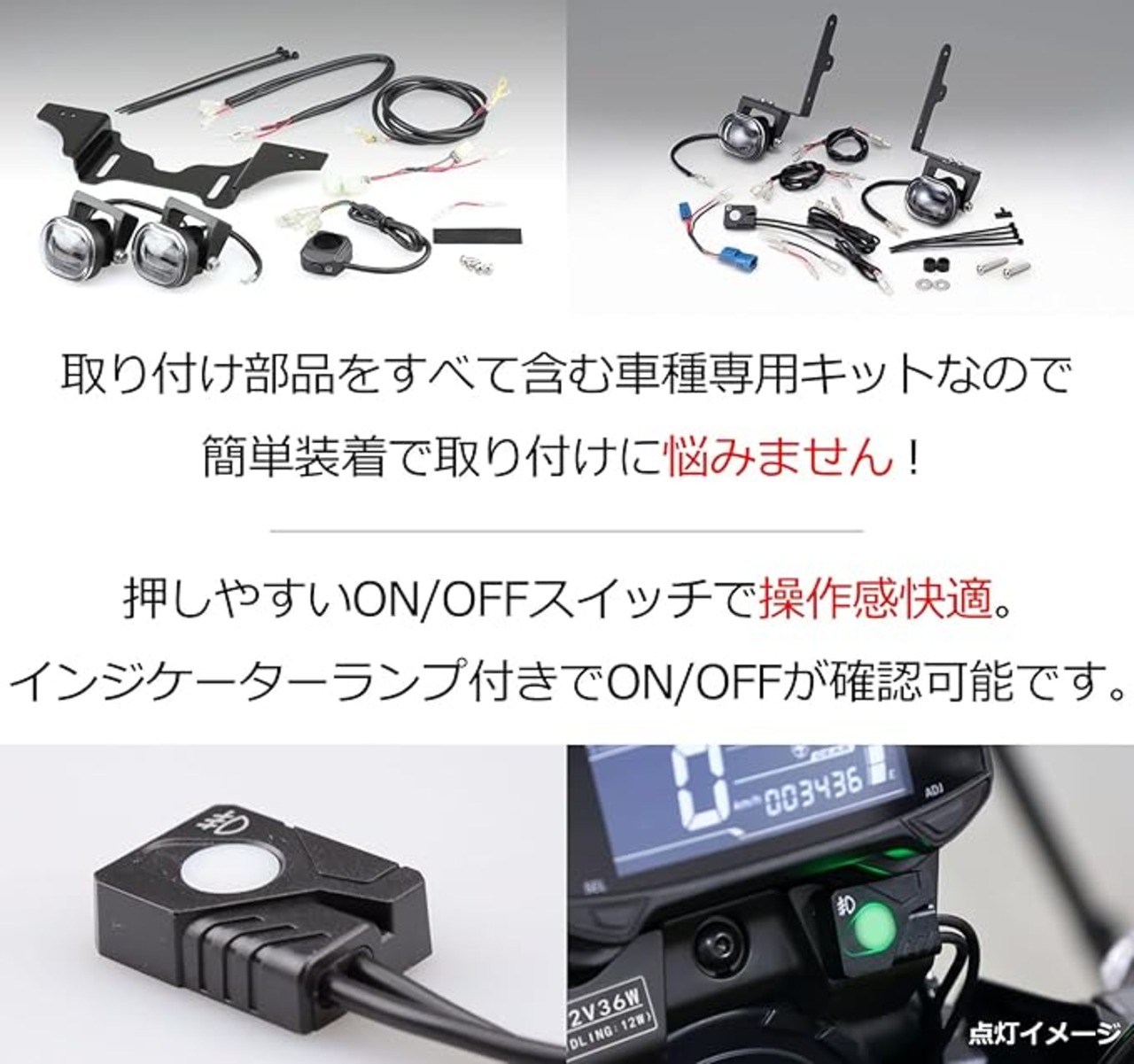 車種専用設計のブラケットやON/OFFの状態が一目でわかるフォグランプスイッチ等、装着に必要な部品を全て含まれているので悩むことはありません。