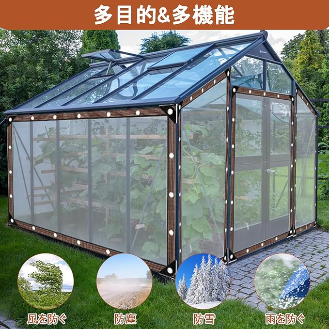 優れた保護性能: 半透明のデザインで、視界を妨げず、光合成を妨げず、雨風から守られながら景色を楽しむことができます。透明ビニールシートは耐寒対策、結露予防、防風、雨除け、雪除け、花粉症対策、防塵、防虫に大活躍します。耐湿性、耐塵性に優れ、屋外の被覆や屋内での使用に最適です