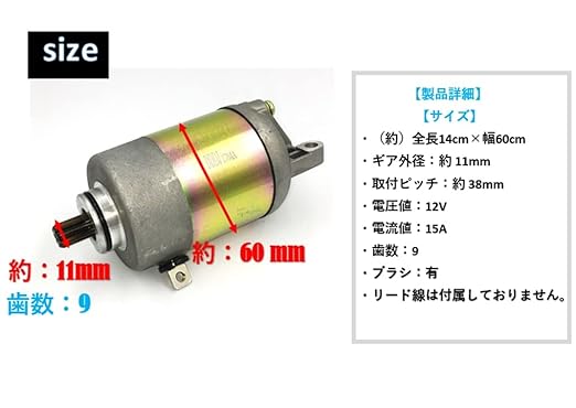 ✅ 【製品の寸法】 ・長さ(全長):約 140mm ・本体の直径:約 60mm ・軸径(mm): 約 11mm ・取付けピッチ(約):38mm ・電圧値:12V ・電流値:15A ・歯数:9 ・ブラシ:有 ・リード線は付属しておりません。 ※ モーター本体サイズは 純正 ノーマル とほぼ同じ。