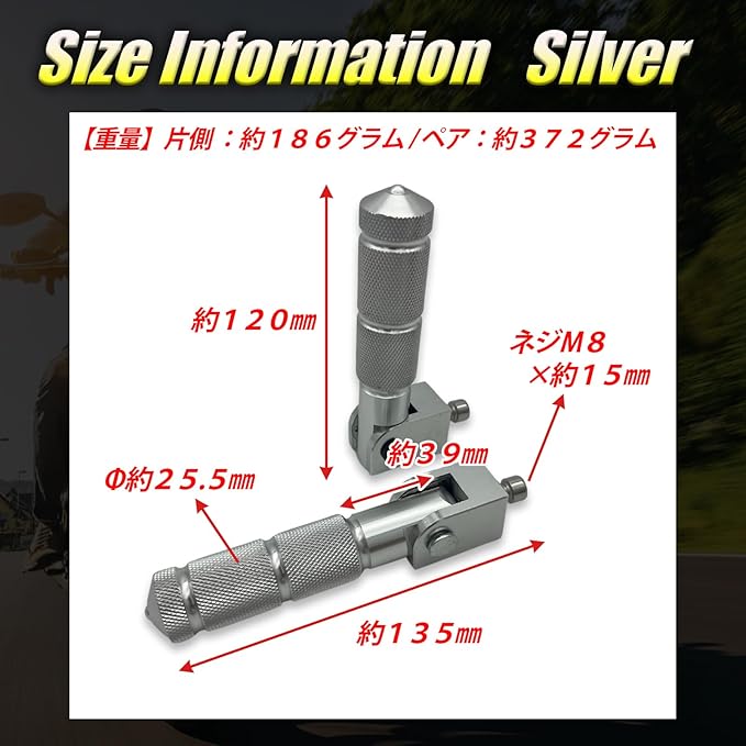 バイク用のタンデムステップ(左右セット)です。可倒式のため使用する時にステップを出して使用し、普段はコンパクトに収納可能です。表面はローレット加工が丁寧に施工されておりで滑りにくく、靴裏が濡れていても安心してご使用いただけます。汎用性があるため、M8取付ボルトで取り付け可能なバイクに広く取り付け可能です。購入前にご自身の愛車のサイズを必ずご確認ください。アルミ削り出しボディで、コンパクトでありながら高強度、耐久性、耐腐食性に優れており、安心して長期間ご使用可能です。 色は定番の黒色と銀色の2色からお選びいただけます。お好みやバイクの色に合わせてお好きな方をお選びください。