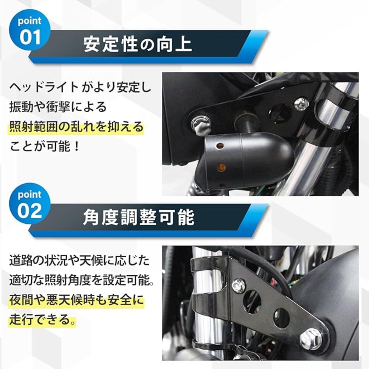 ヘッドライトの安定性の向上:バイク用のヘッドライト ステーを装着することで、ヘッドライトをブラケットで固定できるのでより安定し、振動や衝撃による照射範囲の乱れを抑えるのに役立ちます。