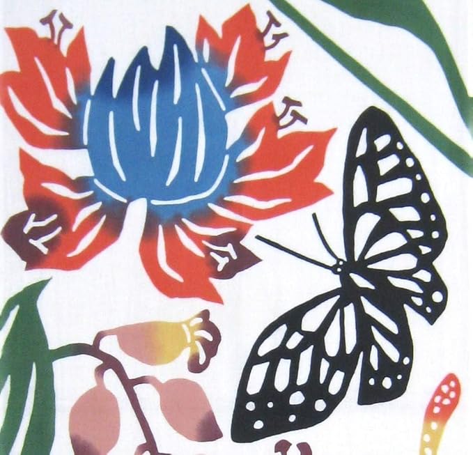 『琉球びんがた』は沖縄の地で生まれ育った唯一の染物で、沖縄の強い太陽の下で映える、顔料を使った華やかな色合いが特徴的な染め物です。ヤギセイの紅型調てぬぐいシリーズは、沖縄「紅型(びんがた)染め」をモチーフにして紅型作家さんによってデザインされた作品を、注染の技法(染料)で製作したオリジナル手ぬぐいです。通常注染(染料)では再現が難しい様な複雑なデザインですが、注染の熟練した技術を要する職人さんにお願いし染めていただいており、他にはない多色使いの出来上がりです。