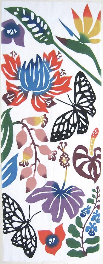 人気の紅型作家シリーズのひとつ、『南国花模様』 。沖縄に咲く個性豊かな植物たちをカラフルに描いた一枚です。