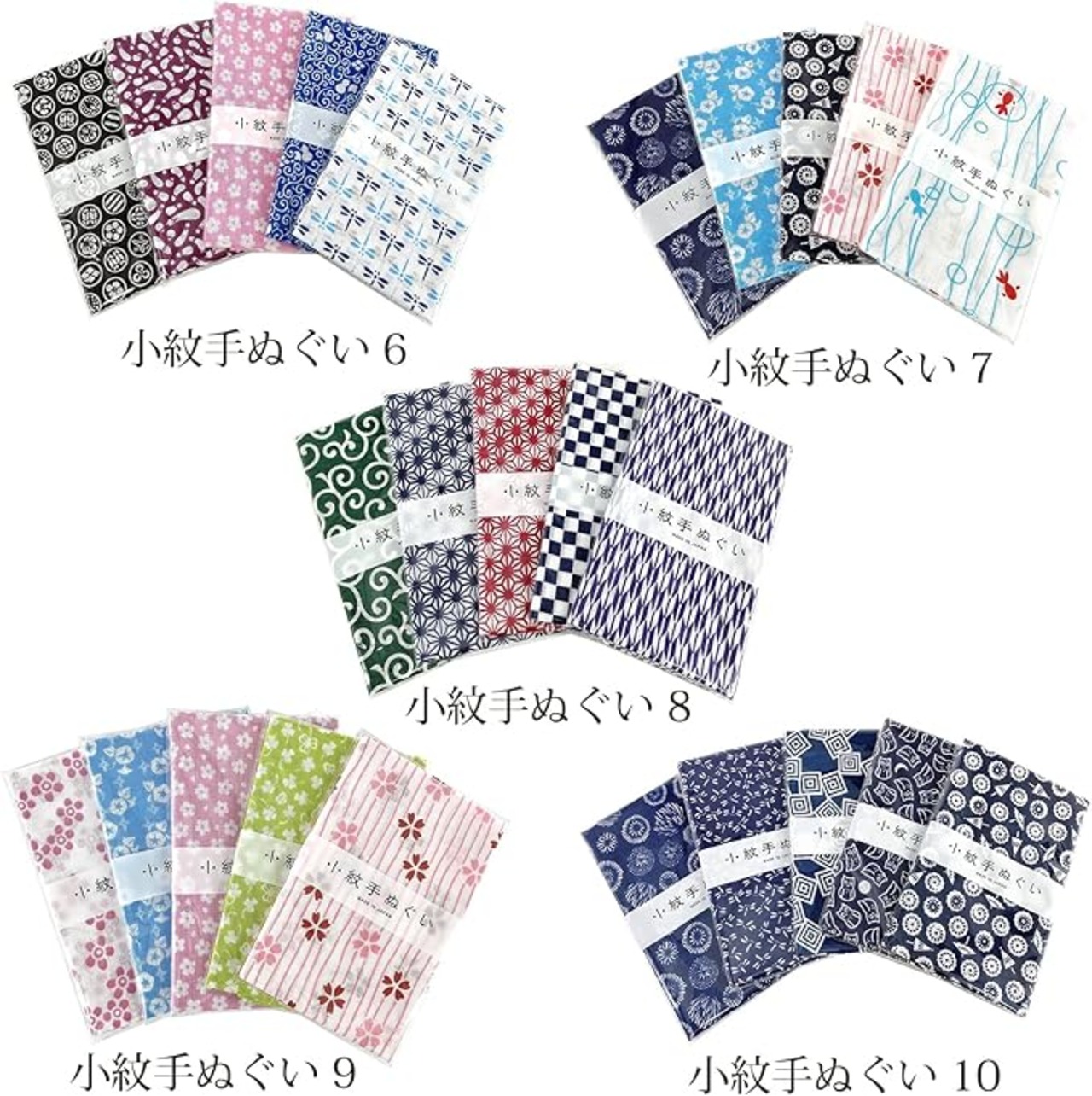 ●裏通しプリントされた小紋柄が5枚セットになった人気の日本製の手ぬぐいです。伝統的な柄から、かわいい柄まで豊富にご用意しております。