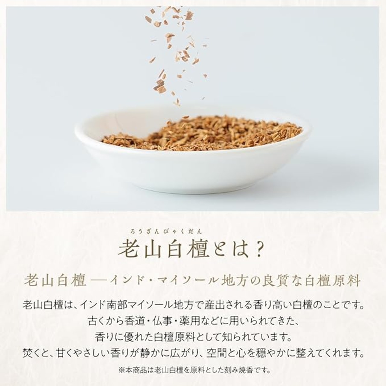 老山白檀を焚くと、上品な甘さと深みのある洗練された白檀の香りを楽しむことができます。