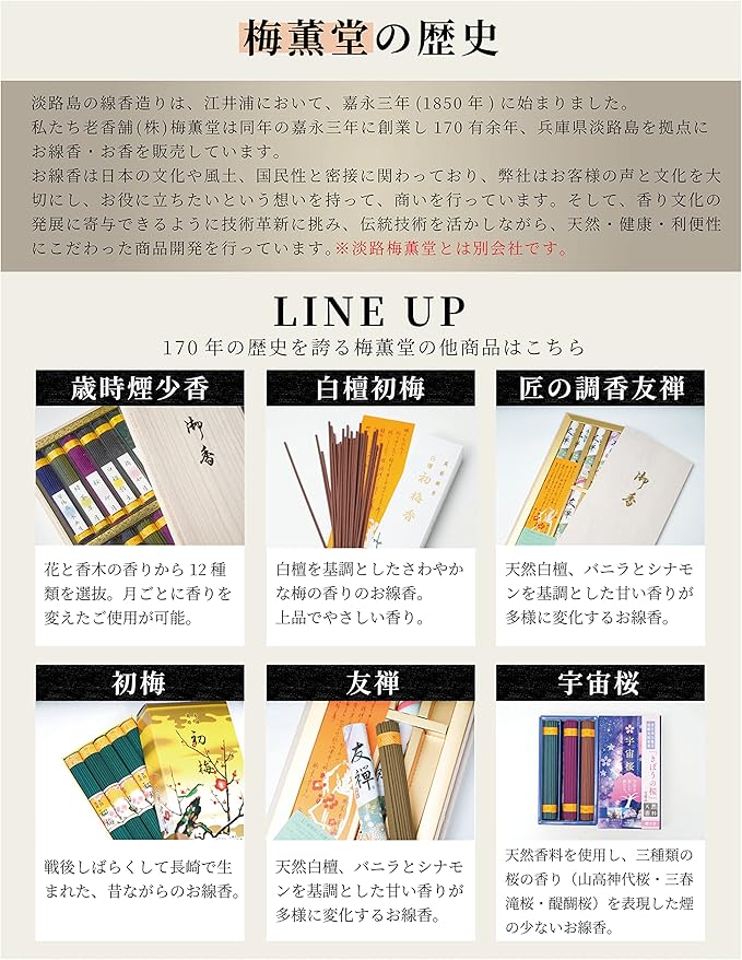 天然白檀、バニラとシナモンを基調とした甘い香りが多様に変化するお線香。 嘉永三年(1850年)創業以来の伝統を受け継ぐ香りの匠が調香。 兵庫県淡路島産の純国内製品。線香のたき方や、空気の流れにより、燃焼時間に多少の変化があります。 線香約50g/小箱 6箱入