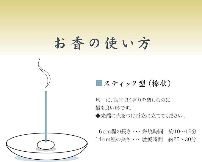 お香をたく際は、灰を受けるのに十分な大きさの不燃性のお皿等を下に敷いてお使いください。