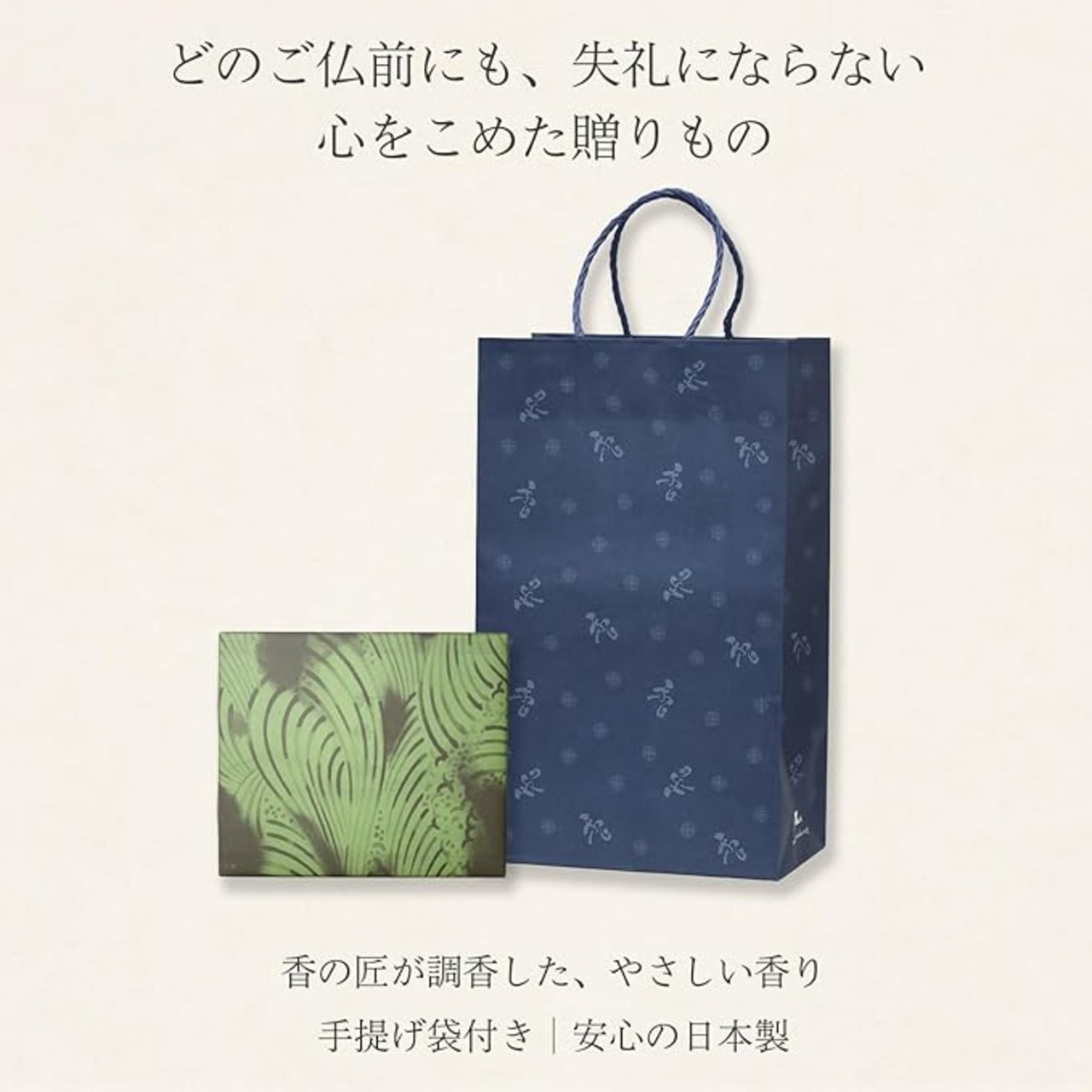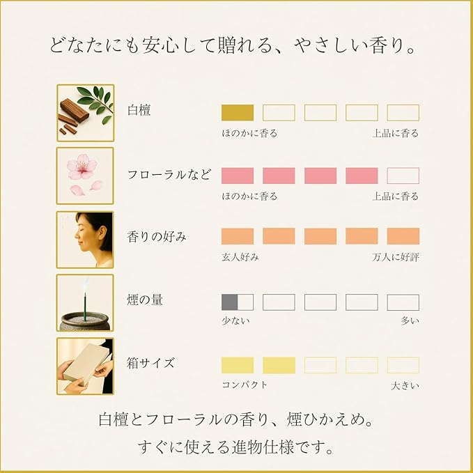 ■ 香りと品質の特長 ・香司(全国に14名のみ)による特別調香 ・白檀とフローラル天然香料を調合したやさしい香り ・煙が少なく、お部屋の空気を汚しにくい設計