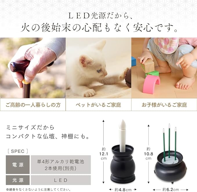 火を使わないLEDローソクとLED線香のセット。小さなお子様がいるご家庭や一人暮らし、ペットがいるご家庭に。火を使わないから、倒れても安心。火災や火傷の心配を軽減。