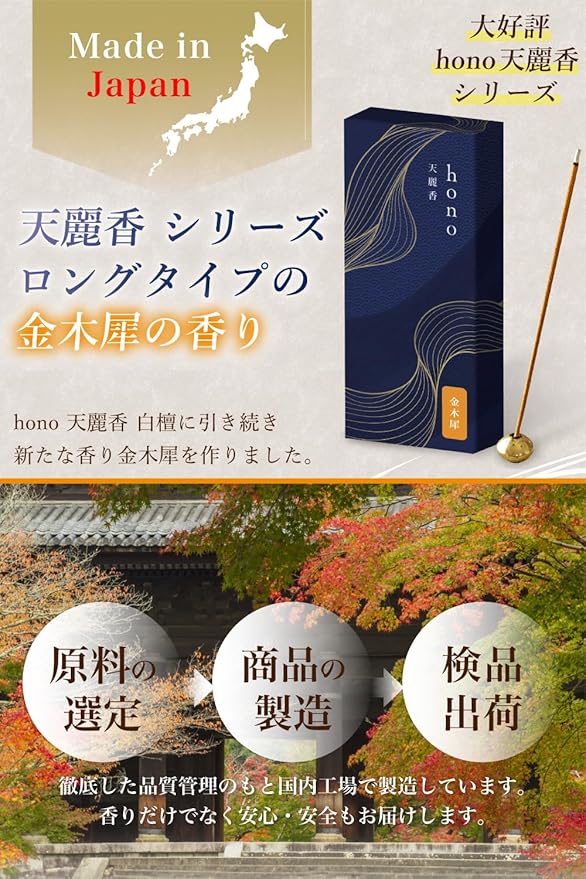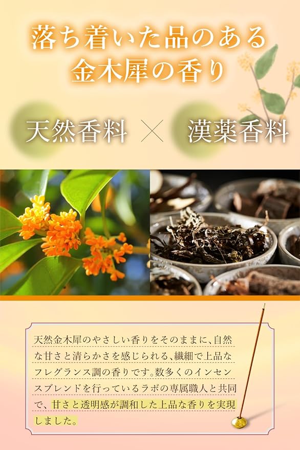 ✅ 香り:金木犀 内容量:約60本入※香立ては付属しておりません。 原産国:日本(兵庫県) 主原料:タブ粉、漢薬、フレグランス香料 燃焼時間:約30分 長さ:約13.5cm 太さ:約2mm 形状:線香(スティックタイプ) 数多くのインセンスブレンドを中心に手がけるラボの専属職人との共同開発