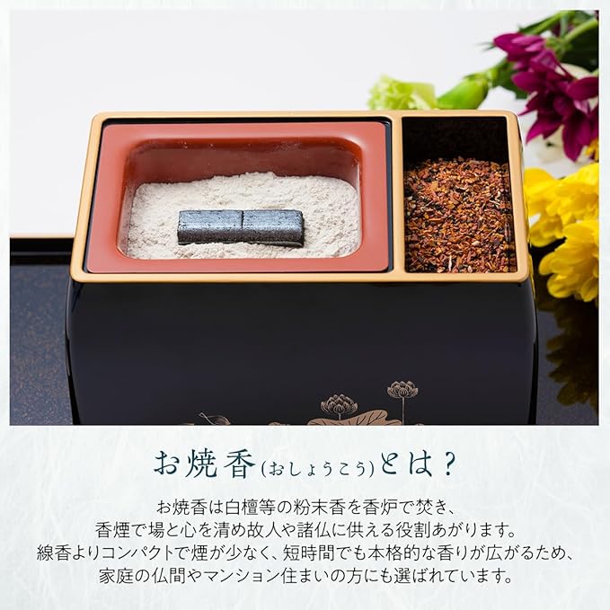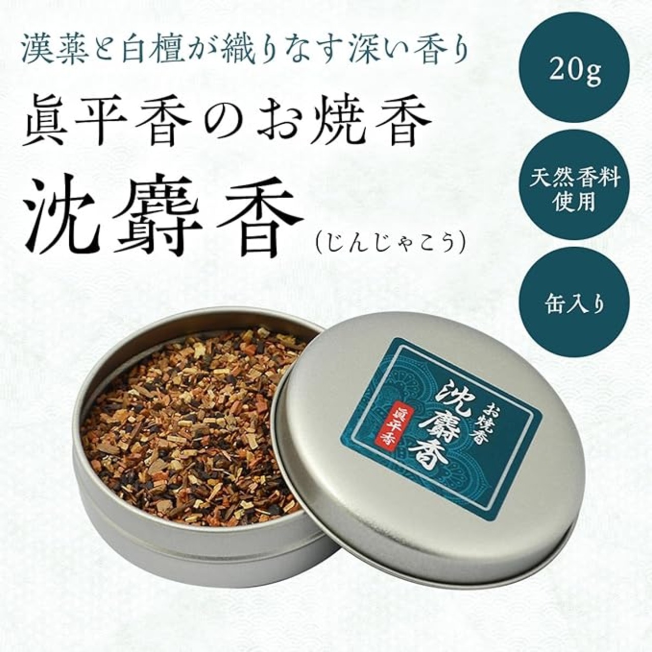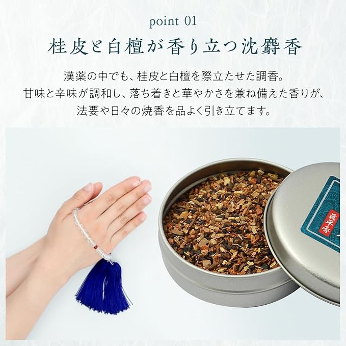 漢薬と、中でも桂皮、白檀を効かせ、甘味、辛味両方がかおる香りです。 缶入りなので、そのままお焼香入れとしてお使い頂けます。