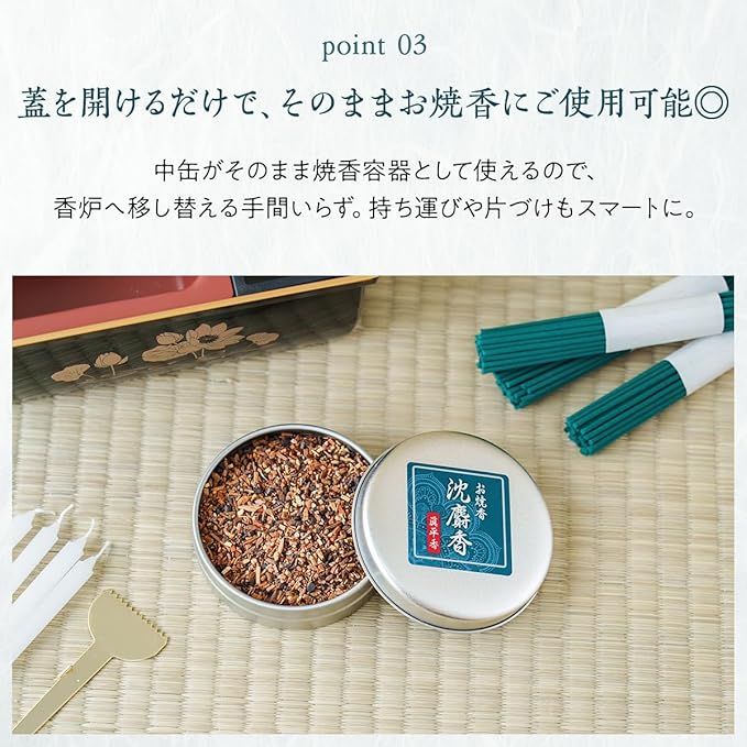 缶入りなので、そのままお焼香入れとしてお使い頂けます。