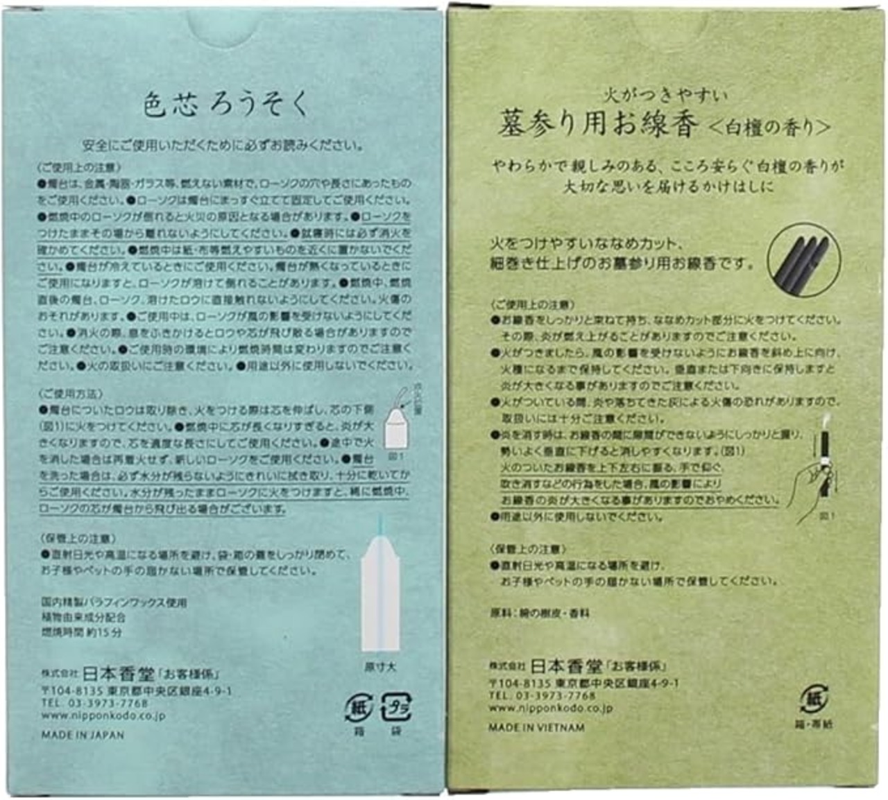 ●詰合せ内容…夢の夢白檀(内容量約40g)、夢の夢さくら(内容量約40g)、火がつきやすい墓参り用お線香白檀4把入、色芯ろーそく(内容量約50g)