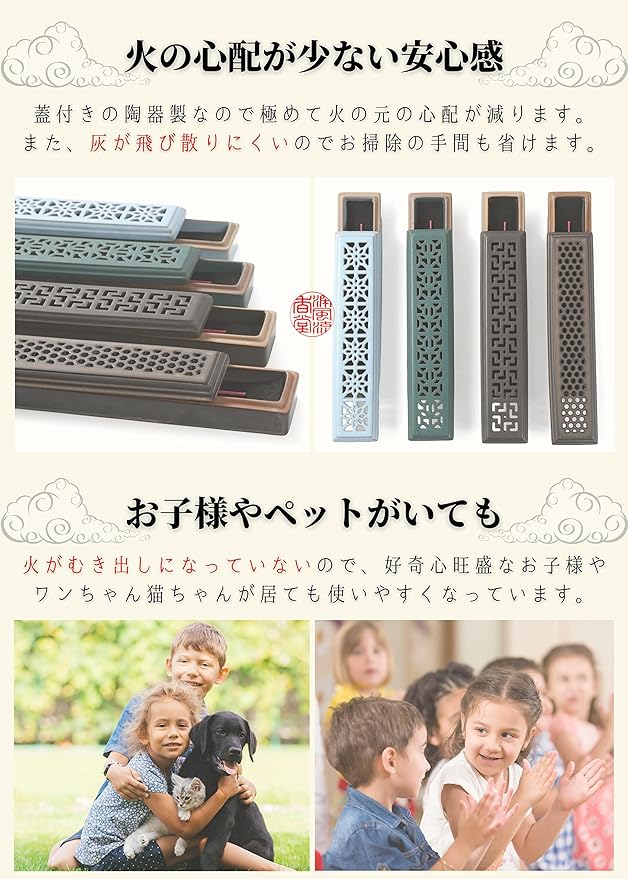 【火の心配がないので使いやすい】蓋付きで陶磁器製の専用香炉なので火の心配が減ります。ワンちゃん猫ちゃんなどのペットと暮らしている方や小さなお子様がいるご家庭でも使いやすいのでお薦めです。また、水洗い可能なので清潔にお使いいただけます。
