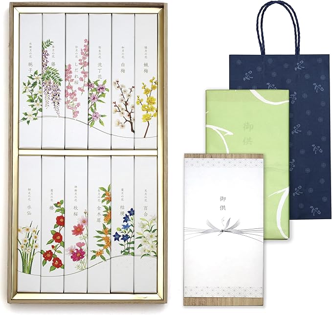 ■ 商品構成 ・月の花12種 各1箱 ・桐箱入り贈答仕様 ・線香の長さ:約13.5cm ・燃焼時間:約25分