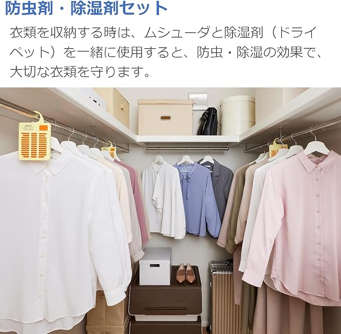 【湿気対策も】衣類を収納するときは、除湿剤(ドライペット)を一緒に使用すると、防虫・除湿の効果で、大切な衣類を守ります。
