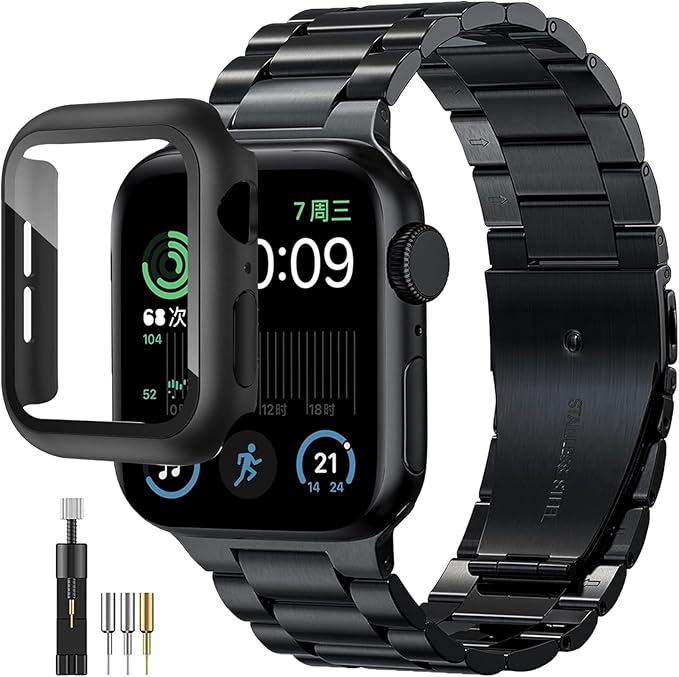 【保護ケース付き】PC素材と硬度強化ガラスで作成された 一体型 apple watch カバー。360度で腕時計を落下衝撃や傷から全面的に保護。バンド横3列になったコマを縦に繋ぎ合わせたブレスレットで、高い堅牢性を持っています。ほとんどの時計メーカーで採用されている3コマモデルで、金属ブレスとしては一番オーソドックスなタイプになります。