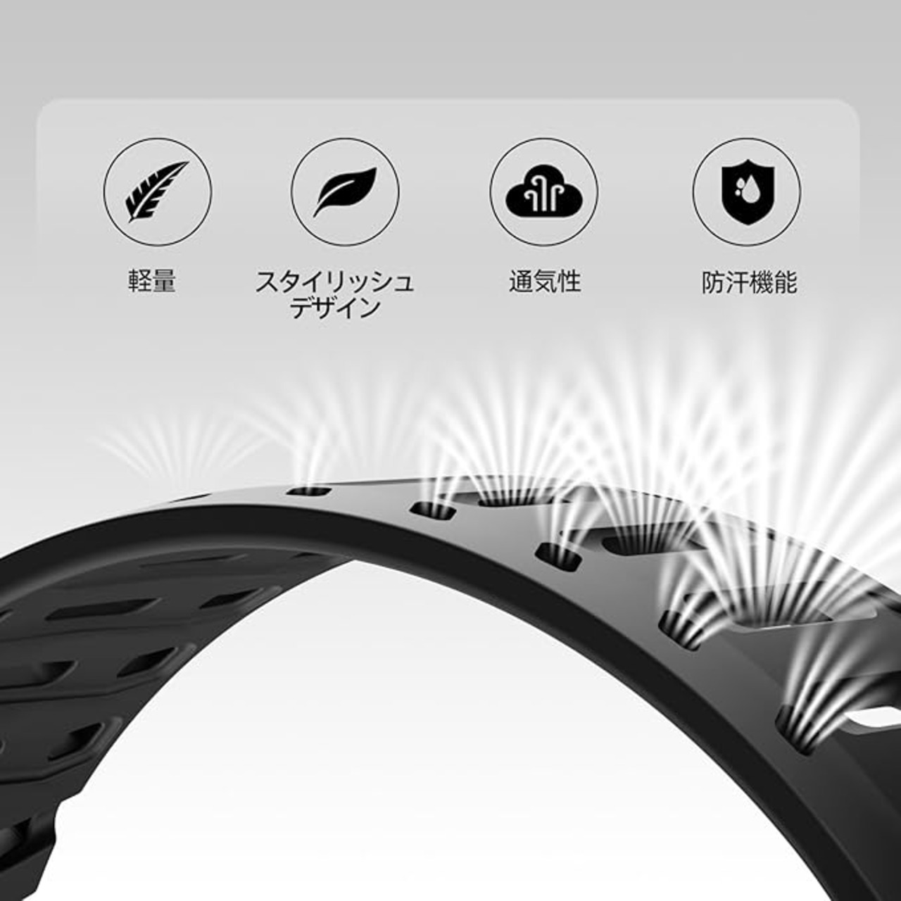 【通気性抜群】for apple watch バンドは多数の通気孔を設計されて、軽量化と通気性の向上に役立ちます。防水性、通気性は手首を乾燥感を維持でき、摩擦を抑えて安全に使います、運動時はもちろん、日常使用における長時間装着にも疲れないです。シリコンバンドは汚れたら水洗いも簡単です。