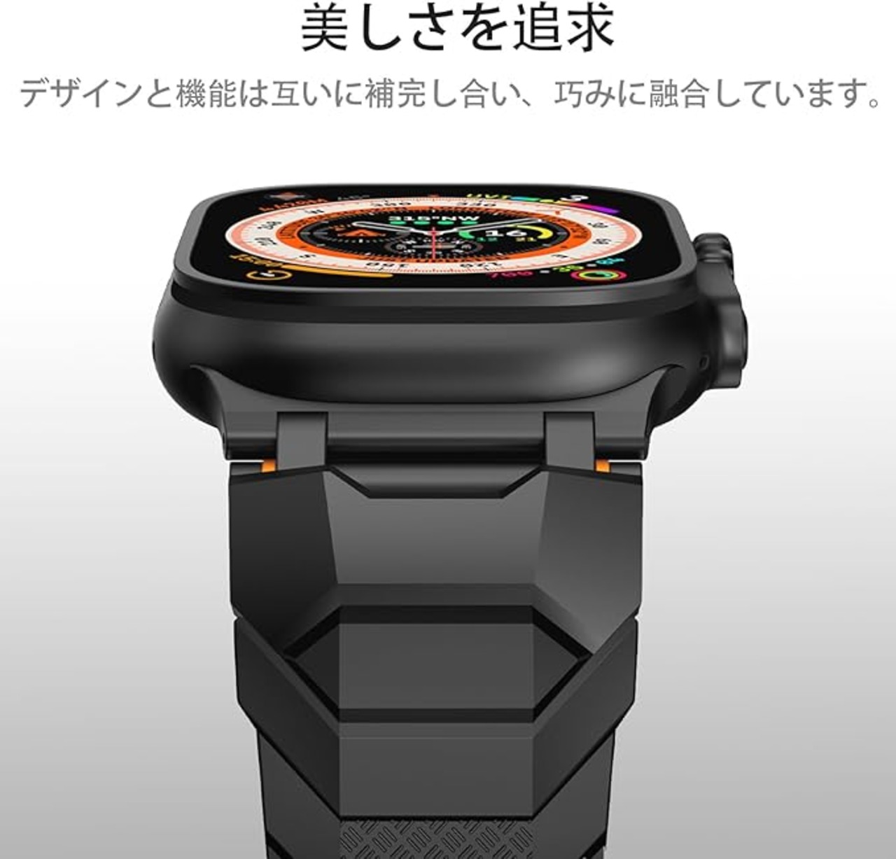【極限スポーツ風】屈強なバンド造形、男性向けの荒っぽいスタイルです。一体型バンドは、メタルコネクター、TPU製で耐久性に優れています。Ultraに最適,カラーマッチしたメタルコネクタは、Apple Watch Ultraのチタン製ケースと調和します。このアップルウォッチベルトは優れた防水性と防汗性で、サーフィン、水泳、登山、ハイキング、キャンプ、ロッククライミングなど冒険スポーツ用には最適です。