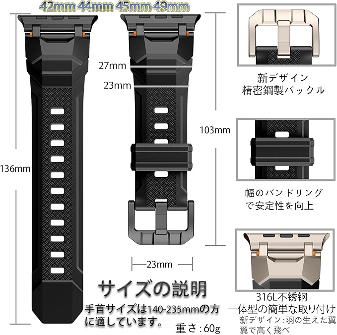 【対応機種・サイズ】このApple Watch スポーツバンドはApple Watch Ultra 2/Ultra [49mm]、Apple Watch Series 10[46mm]、Apple Watch Series 9/8/7[45mm]、Apple Watch SE2/SE/Series 6/5/4[44mm]、Apple Watch Series 3/2/1 [42mm]に対応できます。手首サイズは140mm-215mmの方に適します。バンドの表面に数個の調整穴があり、長さが自由に調整可能です。購入前に、お手首の周りを測定してください。