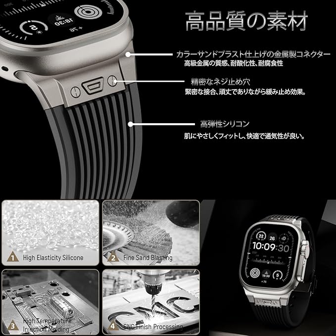 【新設計ステンレス鋼バックル&コネクター】Apple Watch スポーツ バンドは、新設計の耐衝撃折りたたみ式・バックルを採用し、ステンレス鋼バックルの安定性を向上させました。各バンドには、新しい316ステンレス鋼コネクターが付属し、特殊加工され、取り外しと取り付けは簡単であり、丈夫で取れません。色はApple Watch Ultraに合わせました。金具の色はチタンとブラックから選べます。毎日素晴らしい着用体験を提供します。